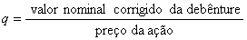 em que a letra q representa a quantidade de ações; o preço da ação é um valor normalmente determinado em função de sua cotação em Bolsa, de seu valor patrimonial, das perspectivas de rentabilidade da Cia, etc. O prazo mínimo de emissão é de um ano para as debêntures não conversíveis e de três anos para as conversíveis; o prazo máximo não é fixado.