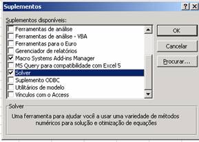 Após clicar Suplementos, você obterá um menu drop-down; role até Solver e clique na caixa. Que deverá estar assim.