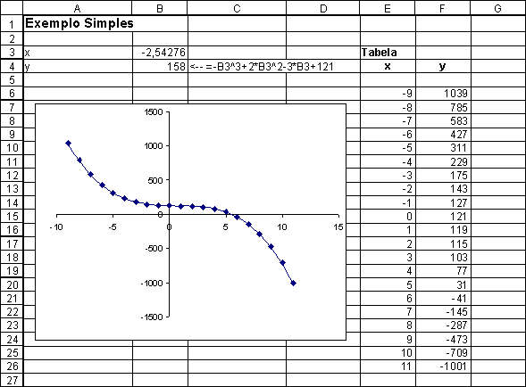 Comecemos com um exemplo de álgebra de colegial. Suponhamos que estamos tentando fazer o gráfico da equação y = x3 + 2 x2 – 3 x - 121. Podemos fazer isto no Excel como segue: