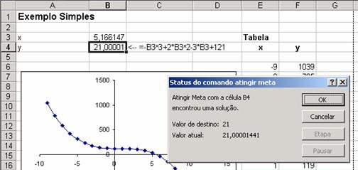 Agora queremos encontrar x tal que o y correspondente seja 22. Da tabela você pode dizer que o valor estará em algum lugar entre 5 e 6. Para encontra-lo, vamos ao Excel em Ferramentas|Atingir Metas. Isto criará uma caixa de diálogo, que preencheremos como abaixo: