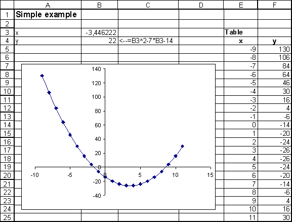 Novamente usamos um exemplo de álgebra, mas desta vez usamos a função y = x2 – 7x - 14.