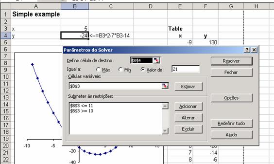 Suponhamos agora que se queira encontrar x tal que y = 21. Como você pode ver acima, existem 2 tais x´s: Um está entre –3 e –4, e o outro está entre 10 e 11. Se você usar o Atingir Metas (Goal Seek), você não pode especificar qual x a encontrar.