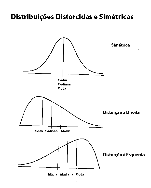algumas observações extremamente grandes ou pequenas (i.e., quando os dados são distorcidos parra a direita ou para a esquerda). Por esta razão, a renda mediana é usada como a medida de posição para a renda familiar nos U.S.A. Note que se a mediana for menor do que a média, o conjunto de dados é distorcido para a direita (i.e., os dados tendo limites inferiores mas não limites superiores resultarão numa distorção positiva para a direita). Se a mediana for maior que a média, o conjunto de dados é distorcido para a esquerda (os dados têm limite superior mas não têm limite inferior resultarão numa distorção negativamente para a esquerda). A mediana não tem propriedades matemáticas importantes para uso nos cálculos futuros. Ver a figura seguinte: