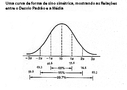 Aproximaddamente 68% das medidas (dados) cairão dentro de um desvio padrão da média, 95% cairão dentro de dois desvios padrões, e 97,7% (ou quase 100% ) ficam dentro de três desvios padrões. Ver a figura seguinte: