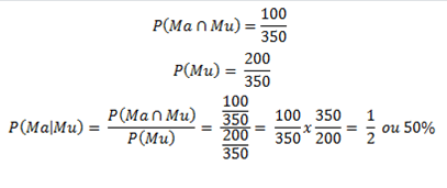 Pelo quadro vemos que temos 100 mulheres cursam matemática num total de 200 mulheres, isto é, cursando matemática dado que seja mulher é 100 entre 200, ou seja,