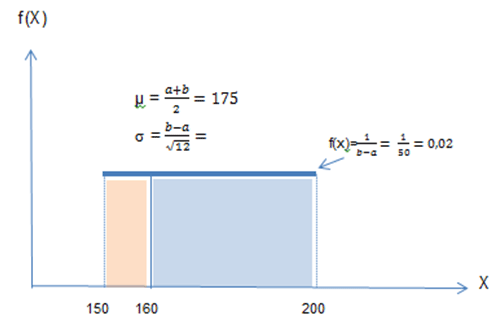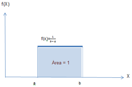 Note que no gráfico acima, como a área do retângulo = (comprimento)(altura) =1, e como o comprimento = (b - a), então podemos escrever: (b - a)(altura) = 1 ou altura = f(X) = 1/(b - a).