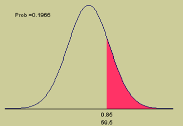 A média é igual a (n x p) = (80 x 0,70) = 56 e o desvio padrão é a raiz quadrada de [(n x p)(1 - p)], i.e., raiz quadrada de 16,8, que ée igual a 4,0988. Usando a equação Z obtemos, Z = (X - média)/desvio padrão = (59,5 - 56)/4,0988 = 0,854. Da tabela, a probabilidade para este Z score é 0,302338 que é a probabilidade entre a média (56) e 60. Devemos subtrair este valor da tabela 0,302338 de 0,5 para obter a resposta, i.e., P(X >= 60) = 0,5 -0,302338 = 0,1977. Portanto, a probabilidade é 19,77% que 60 ou mais dos 80 clientes pela primeira vez retornarão ao restaurante para outra refeição. Veja o gráfico seguinte.