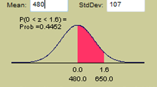 O número completo e a porção das casas decimais do Z score aparecem na primeira coluna da tabela normal padronizada. Pelo topo da tabela são os valores da porção centesimal do Z score. Assim a resposta é que 0,4452 ou 44,52% dos scores no GMAT caíram entre um score de 650 e 480.