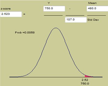 i.e., P(X >= 750) = ?. Este problema é respondido determinando-se a área da cauda superior da distribuição. O Z score é: Z = ( 750 - 480)/107 = 2,52. Da tabela, a probabilidade para este Z score é 0,4941. Esta é a probabilidade de um GMAT com um escore entre 480 e 750. A regra é que quando queremos encontrar a probabilidade numa cauda, devemos subtrair o valor da tabela de 0,50. Assim, a resposta para este problema, usando a tabela normal é: 0,5 - 0,4941 = 0,0059 ou 0,59%. Note que P(X >= 750) é o mesmo que P(X >750), porque, com distribuição contínua, a área sob um número exato tal como X=750 é zero. A figura seguinte mostra uma representação gráfica deste problema.