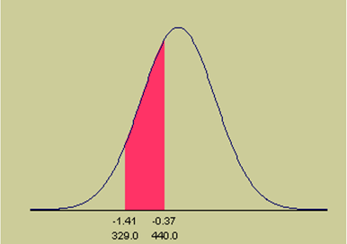 Neste problema, os dois valores caem do mesmo lado da média. Os Z scores são: Z1 = (330 - 480)/107 = -1,4019, e Z2 = (440 - 480)/107 = -0,3738. Assim, usando a tabela normal,