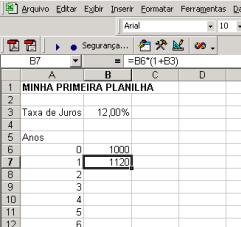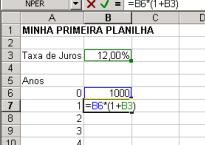Vá para a célula???. Nós queremos ter a fórmula “=B6*(1+B3)“ nesta célula. Nós sugerimos que você não digite esta fórmula. Ao invés disso coloque-a apontando para a célula correta. Aqui está o que você deve fazer: