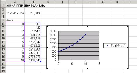 Você vai querer um gráfico daquilo que está acima. Leve seu mouse, ponha na célula A6; aperte o botão esquerdo e mova até que você chegar à célula B16: