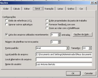 Cada uma destas folhas pode ser programada e também nomeada separadamente (veja abaixo). Mas o fato que permanece é que a maioria dos usuários usa só uma folha por agenda de trabalho. Nós sugerimos que você mude os defaults de forma que o Excel começe uma nova agenda de trabalho com somente uma planilha eletrônica (você sempre pode somar mais). Para fazer isto, vá para Ferramentas|Opções e clique na aba Geral: