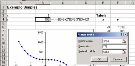 Agora queremos encontrar x tal que o y correspondente seja 22. Da tabela você pode dizer que o valor estará em algum lugar entre 5 e 6. Para encontra-lo, vamos ao Excel em Ferramentas|Atingir Metas. Isto criará uma caixa de diálogo, que preencheremos como abaixo: