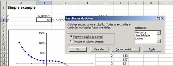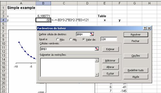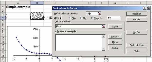 Podemos fazer o mesmo cálculo com o Solver. Na mesma planilha, vamos ao comando Ferramentas|Solver. Isto leva a uma caixa de diálogo que preenchermos como segue (note que mudamos um pouco a pergunta – desta vez queremos o valor de x que dá um y = -58):