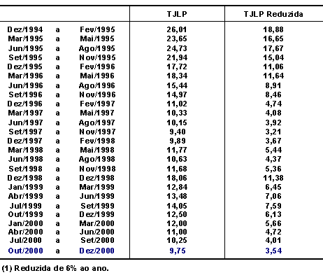 Apesar desta alteração, a TJLP vinha apresentando tendência de alta ao longo do ano de 1999. A taxa vigente no 1o trimestre/99 foi de 12,84% a.a., tendo evoluído crescentemente até atingir 14,05% a.a. no 3o trimestre. Mantido o critério de cálculo, o valor da TJLP seria ainda maior no 4o trimestre/99, comportamento este que esbarrava no desempenho da taxa Over/Selic que vinha apresentando viés de queda desde abril/99.