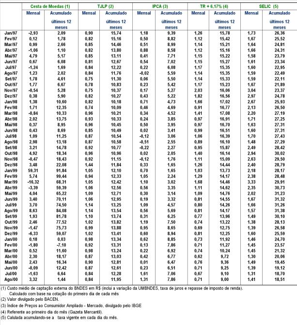 No Anexo 1, encontra-se uma comparação, para o período de janeiro de 1997 a agosto de 2000, entre a evolução da TJLP, do Custo da Cesta de Moedas do BNDES (Res. n0 635/87), da Taxa Referencial (TR), da SELIC e do IPCA, mensal e acumulado nos últimos 12 meses. No Anexo 1 é apresentada ainda a evolução comparativa destas taxas (mensal e acumulada nos últimos 12 meses) deflacionadas pelo IPCA.