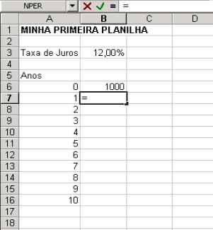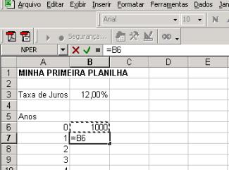 Agora aponte para a célula B6, a que contém 1000. Você pode apontar com o mouse (clicando quando você está sobre B6), ou você pode apontar com as teclas de seta.