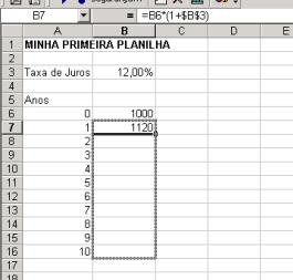 Para copiar a fórmula da célula, ponha o cursor na pequena caixa preta ao da mão direita e canto debaixo da célula B7. Aperte o botão esquerdo do mouse, e arraste para baixo até você chegar a célula B16: