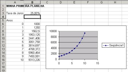 Este gráfico tem muitas características que nós não gostamos, mas todos elas podem ser fixadas (Capítulo??? novamente). Em vez de fixar coisas, rode a planilha – mude a taxa de juros e veja o que acontece: