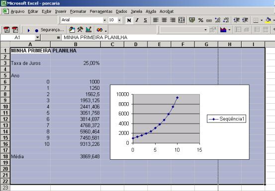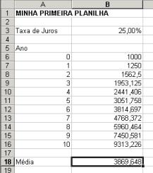 Na célula B18 calcularemos o valor médio das células B6:B16 (isto tem muito pouco significado econômico...). Aqui está o que fizemos: