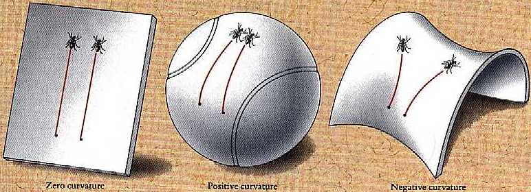 esféria (curvatura positiva), plana (curvatura zero), e hiperbólica