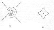 Fig.01 - Colapso do átomo clássico. (a) As teorias de Newton e Maxwell predizem que um elétron atômico que segue uma órbita irradiará continuamente ondas eletromagnéticas, perdendo assim energia e caindo em espiral até o núcleo. (b) A teoria quântica prediz a existência de níveis de energia discretos não radioativos nos quais a onda associada ao elétron precisamente ajusta-se ao redor do núcleo, formando padrões de ondas estacionárias reminescentes das notas num instrumento musical. (A onda deve ajustar-se-á também na direção radial).