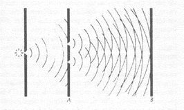 Fig. 03 - Ondas ou partículas? Neste experimento da dupla fenda os elétrons ou fótons da fonte atravessam duas aberturas vizinhas no anteparo A e viajam até incidir no anteparo B, onde se registra seu ritmo de chegada. O padrão de intensidade variável que se observa indica um fenômeno de interferência ondulatória.