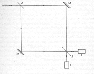 Um dispositivo idealizado projetado para realizar um experimento do tipo de escolha-retardada (com fótons, não com elétrons) aparece na Figura 4 e forma a base de um experimento real feito recentemente por Carrol Alley e seus colegas na Universidade de Maryland. Um raio laser incidente sobre um espelho semi-prateado A divide-se em dois feixes análogos aos dois caminhos através das fendas no experimento de Young. Reflexões ulteriores nos espelhos M redirigem os feixes de modo que se cruzam e entram nos detectores 1 e 2, respectivamente. Neste dispositivo uma detecção de um fóton dado, seja por 1 ou por 2, basta para determinar qual dos caminhos alternativos terá o fóton tomado.