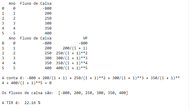 print("\nA TIR é: ", round(100*TIR,2), "%")