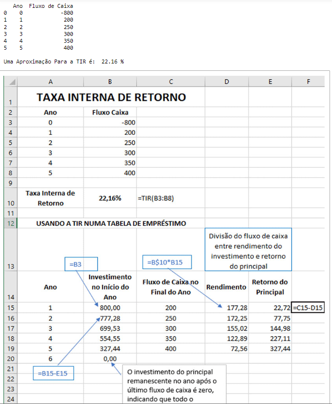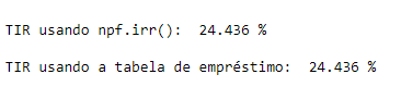print("\nTIR usando a tabela de empréstimo: ", round(i*100,3),'%')