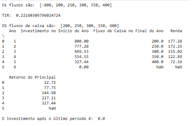 print("\nOs fluxos de caixa são: ", fluxos)