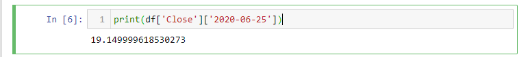 Também, podemos ir adiante e imprimir o valor de fechamento de uma data específica que estivermos interessados nela. Isto é possível porque a data é nossa coluna índice.