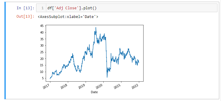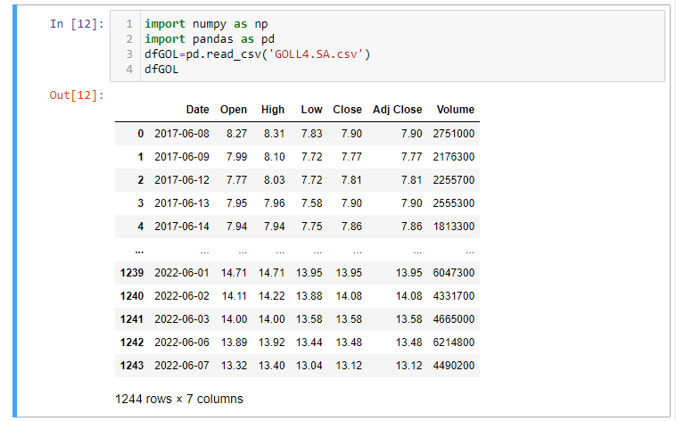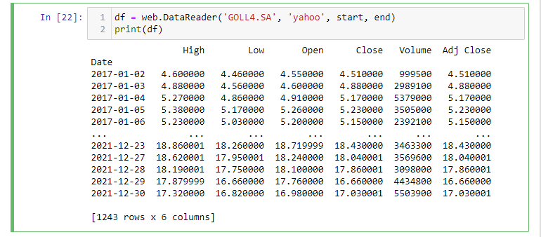Estamos criando, portanto, uma instância do DataReader e passamos os quatro parâmetros. Nesse caso, estamos usando o Yahoo FinanceR API, a fim de obter os dados financeiros da GOL (GOLL4.SA) da data inicial (2017,1,1) até a data final (2022,1,1).