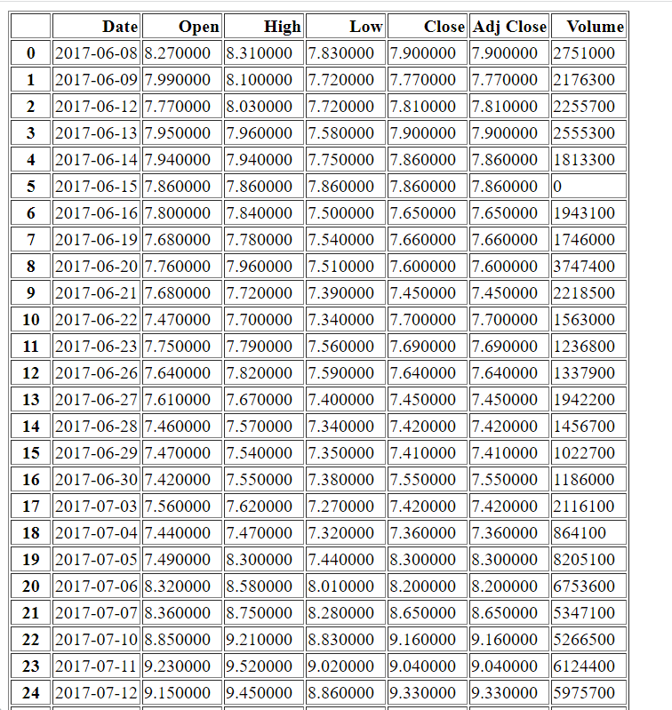 Como você pode ver, agora temos um data frame (quadro de dados) com todas as entradas desde a data de início até a data de término. Observe que temos várias colunas aqui, e não apenas o preço de fechamento das ações do respectivo dia. Vamos dar uma olhada rápida nas colunas individuais e seu significado.