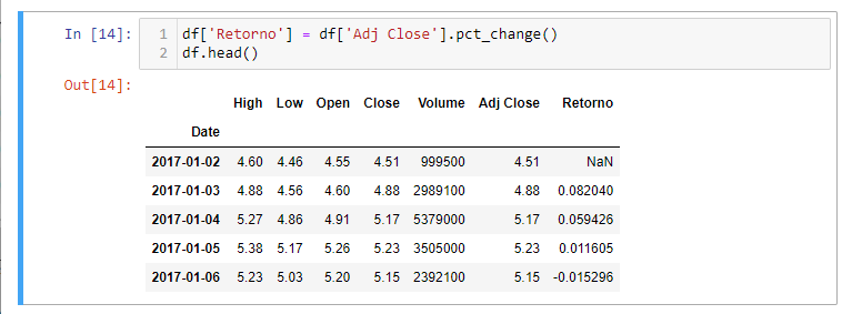 Ainda mais, pode-se criar uma coluna no DataFrame para armazenar séries de retorno da GOLL4.SA ou usar a função embutida do Pandas .pct_change():