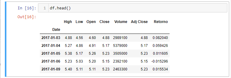 Quando se aplica a .pct_change(), você precisa se garantir que as datas estejam em ordem crescente. Quando movemos os preços para os retornos, perdemos um ponto de dados. O NaN, como na primeira linha dos dados, pode tornar os cálculos posteriores problemátifcos. Podemos retirar essa linha com:
