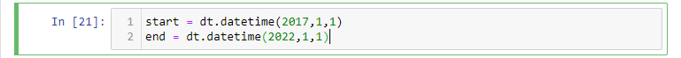 Aqui definimos uma data de início e uma data de término. Esse é o nosso prazo. Quando carregamos os dados, queremos todas as inscrições a partir do 1º de janeiro de 2017 até o dia 1º de janeiro de 2022. Alternativamente, também podemos usar a função datatime.now, para especificar o presente como a data final.