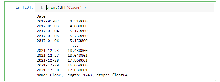 Uma vez que nossos dados estão armazenados em um data frame Pandas, podemos usar a indexação que já conhecemos, para obter valores individuais. Por exemplo, só poderíamos imprimir os valores de fechamento.