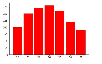 valor = pd.array([20,22,24,26,28,30,32]) freq = pd.array([100, 150, 170,180, 160, 120, 90]) width_n = 1.75 # Largura das Colunas bar_color = 'r' # Cor da barra = Vermelho plt.bar(valor, freq, width=width_n, color=bar_color) plt.show()
