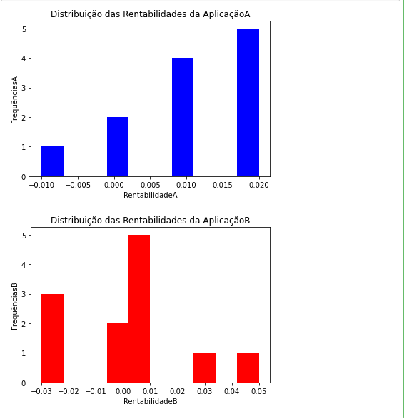 contagemA = dist_freqA['RentabilidadeA'].count() # contagem das linhas na matriz contagemB = dist_freqB['RentabilidadeB'].count() # contagem das linhas na matriz