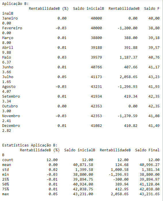 print('\nEstatísticas Aplicação B:\n',matriz_rentabilidadeB.describe(), '\n')
