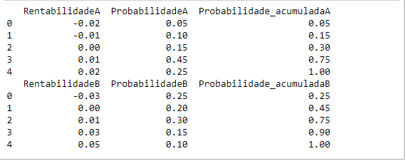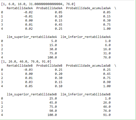 Com essas probabilidades acumuladas construímos os intervalos de números aleatórios e a matriz de busca para as rentabilidades dados os números aleatórios