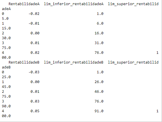 matriz_buscaA = dist_freqA.loc[:,['RentabilidadeA','lim_inferior_rentabilidadeA','lim_superior_rentabilidadeA']] print(matriz_buscaA) matriz_buscaB = dist_freqB.loc[:,['RentabilidadeB','lim_inferior_rentabilidadeB','lim_superior_rentabilidadeB']] print(matriz_buscaB)